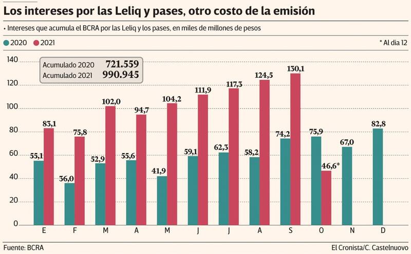 Pero la realidad marca que al 12 de octubre, último dato disponible en la web del BCRA, los intereses acumulados durante el año por las Leliq y pases ascendían a $ 990.945 millones.