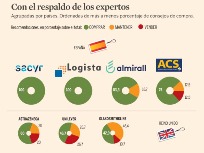 ACS. Es una de las mayores empresas de infraestructuras del mundo. Su diversificación geográfica y por líneas de negocio le permiten aprovecharse de oportunidades en mercados en constante crecimiento y protegerse de la ciclicidad que afecta a su sector, según Deutsche Bank. Su prestigio le ha permitido adjudicarse importantes concursos en EEUU y Australia, dos de los mercados más importantes de grandes infraestructuras del mundo. Está recomendada por el 75% de las firmas que siguen el valor, que le dan un potencial de revalorización del 52%, de media. Intermoney asegura que es un valor con dividendo que ofrece crecimiento a un precio razonable, según Guillermo Barrio. "Pese a la recuperación desde marzo, el mercado no ha valorado aún la resiliencia de las operaciones de ACS, así como las ventajas de su presencia global de las operaciones de construcción. A esto se suma una posición de deuda neta casi nula, y una liquidez superior a 12.000 millones", explica. Hay otras compañías del Ibex aconsejadas, pero tienen un riesgo más elevado. Es el caso de Ence, Acerinox, Cie o Repsol. Entre el resto de compañías del mercado destacan Logista y Sacyr, que logran el más difícil todavía, un amplio seguimiento de analistas, un 100% de recomendaciones y un potencial superior al 30%.