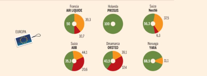 ACS, Almirall, Logista y Sacyr son algunas de las compañías españolas señaladas por los expertos, además de europeas como Unilever, Nestlé, AstraZeneca, Orsted, GlaxoSmithKline, Air Liquide y ABB. En otros mercados destacan las estadounidenses Microsoft, Amazon, Google, Visa, United Health y la asiática Tencent, entre otras.