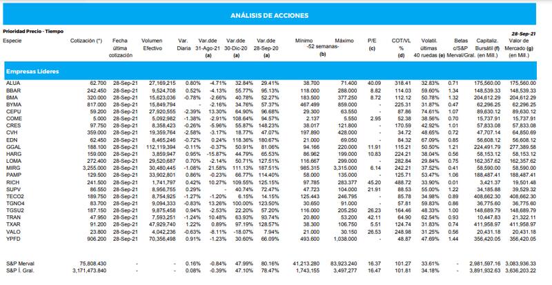 El panel líder se mostró mixto, con mitad de velas rojas y mitad de velas verdes. La suba principal la mostró Ternium (1,22%), seguida por Holcim (0.95%), Transportadora Gas del Sur (0,94%) e YPF (0,91 por ciento).