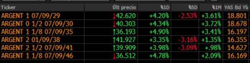 Los bonos también suben con fuerza. La parte corta de la curva opera con ganancias de 4,2% para el Global 2029 y del 4,3% para el Global 2030. En la parte media, la deuda sube 4,9% para el Global 2035 y de 3,6% en el Global 2038. Finalmente, en el extremo más largo de la curva, los bonos suben un 4% y 4,8% los Globales 2041 y 2046.