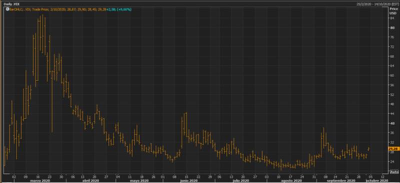 El nerviosismo también se podía percibir en el índice de volatilidad VIX, el cual pegó un salto durante la madrugada y comienzo de la rueda el viernes del 10% operando en niveles de 29,3 puntos, el nivel más alto en una semana.