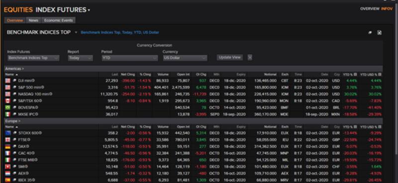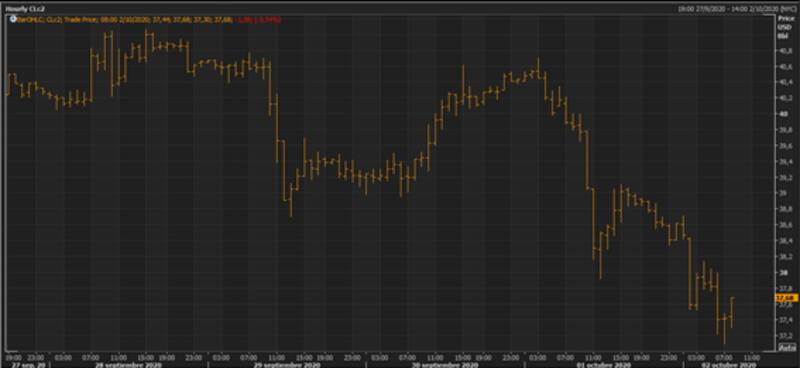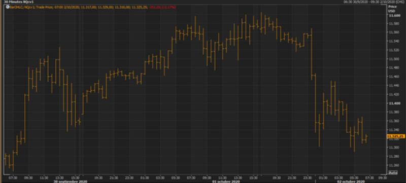 Apenas se supo la noticia del positivo en coronavirus en Trump, los futuros de los índices americanos se desplazaron fuertemente a la baja. El Nasdaq pasó rápidamente desde los 11.560 puntos hacia los 11.300 puntos a partir de conocida la noticia. Misma dinámica se observó en el S&P 500 y en el índice industrial Dow Jones durante la madrugada.