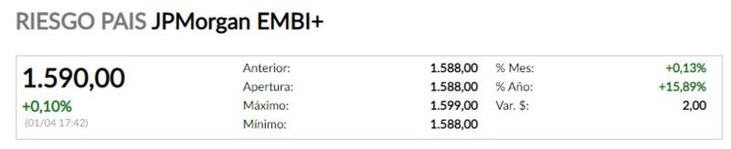 En este contexto, el riesgo país se ubica en 1590 puntos. El índice que mide JP Morgan continúa así más de 500 unidades por encima del nivel que mostró en septiembre, una vez que se efectuó el canje de deuda.