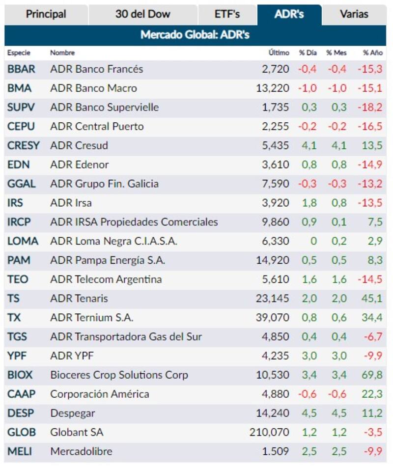 También mayoría de subas registraron los ADR locales que operan en Wall Street. Las acciones de las compañías argentinas también se plegaron al comportamiento positivo de los mercados de Nueva York y dejaron avances de hasta 4,5%, liderados por Despegar. Detrás, con una suba de 4,1%, quedó Cresud, mientras que Bioceres Crop Solutions completó el podio al avanzar 3,4%.