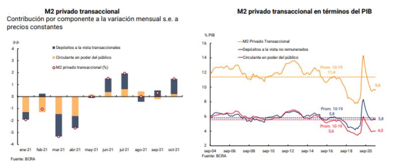 "En octubre el M2 privado transaccional se ubicó en 9,8% del Producto, registro similar al verificado en los meses previos. De este modo, continuó situándose por debajo del registro promedio para el período 2010- 2019. El bajo nivel de los medios de pago en términos del PIB se explicó fundamentalmente por la dinámica del circulante en poder del público, dado que la vista transaccional se ubicó en torno a la media", indicó el documento.
