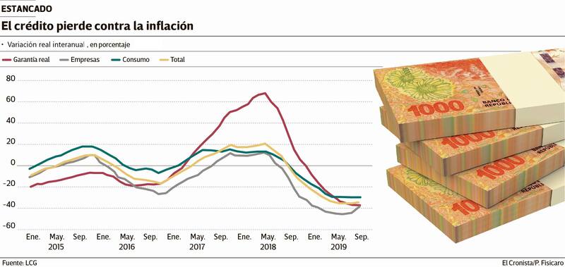 El resto de los préstamos a hogares también se retrajo entre septiembre de 2018 e igual mes de 2019. Los personales cayeron 37,3% real; los hipotecarios, 32,9%; y tarjetas de crédito, 19,9%.