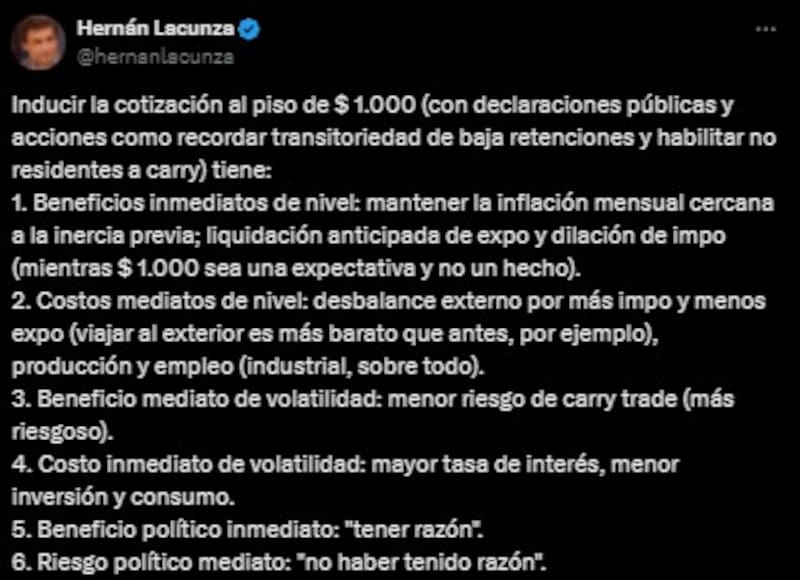 En ese contexto, Lacunza cuestionó la política cambiaria del Gobierno y enumeró tres contras de llevar la cotización al piso de la banda de no intervención, "(con declaraciones públicas y acciones como recordar transitoriedad de baja retenciones y habilitar no residentes a carry)".