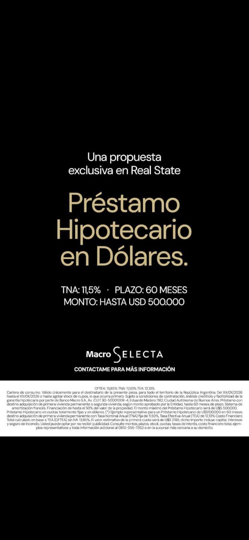 Por ejemplo, Banco Macro prepara un lanzamiento de créditos hipotecarios en dólares. Se filtró un boceto que habla de una línea a cinco años, tasa fija del 11,5% y un tope de 500.000 dólares. Los términos definitivos se conocerían esta semana. Es una oferta para los clientes de la línea Selecta.