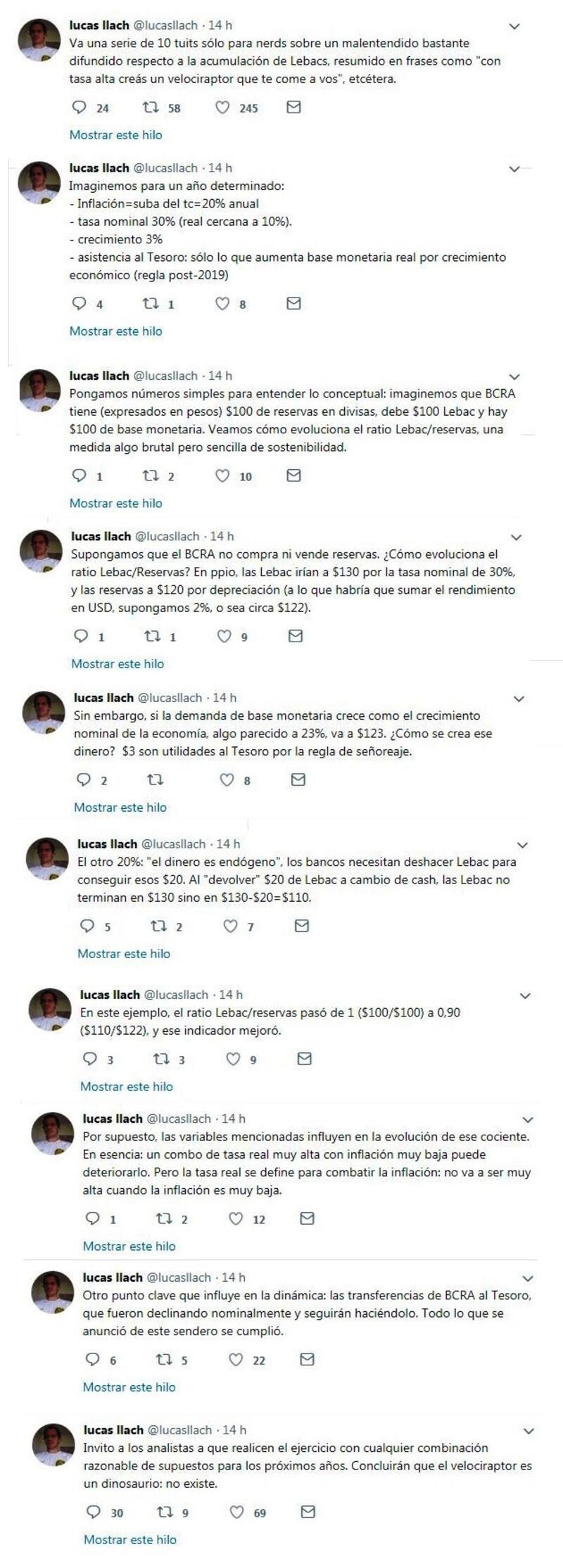 "Va una serie de 10 tuits sólo para nerds sobre un malentendido bastante difundido respecto a la acumulación de Lebacs, resumido en frases como "con tasa alta creás un velociraptor que te come a vos", comenzó.