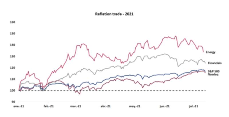 "Las energéticas (+28% en 2021) y empresas de servicios financieros (+24% en 2021) continúan acumulando un mayor retorno que el S&P 500 en lo que va del año. El Nasdaq presentó un rendimiento superior al de sectores cíclicos desde el último comunicado de la Fed, a mediados de junio, cuando se adelantó la proyección de suba de tasas para 2023. Como resultado de lo anterior, la diferencia de rendimiento entre el S&P 500 y el Nasdaq se comprimió fuertemente. Mientras que el S&P 500 retornó 17% en lo que va del año, el Nasdaq acumula un alza de 15,6% en igual lapso", comentaron.