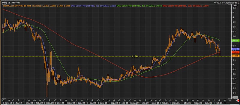 En este contexto de debilidad, los inversores desarman posiciones de riesgo, como son las acciones, y migran hacia activos de cobertura. Por ello es que se ve a la tasa norteamericana a 10 años operando en 1,21%, el nivel más bajo desde febrero.