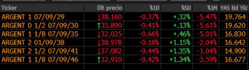 Los bonos argentinos operan a la baja en todos sus tramos. La parte corta de la curva de ley extranjera registra pérdidas de 0,4% a la vez que se observan caídas de hasta 0,7% en el tramo medio y largo.