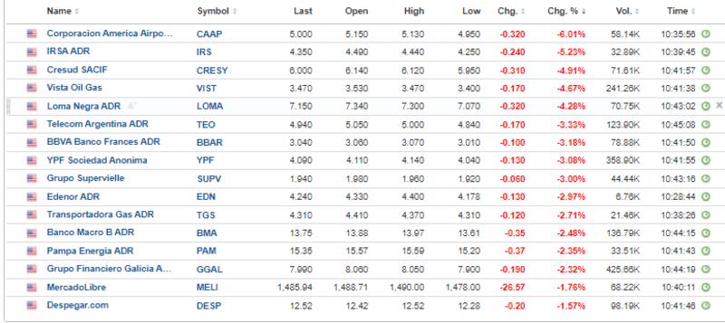El sector financiero retrocede 3% en promedio, al igual que YPF. Ningún ADR opera en positivo y MercadoLibre y Despegar son las que menos caen, perdiendo 1,7% y 1,5% respectivamente.