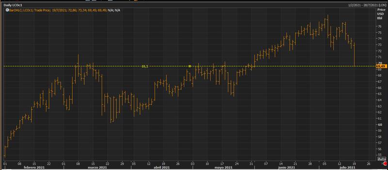 Los futuros del crudo Brent, el índice de referencia internacional, cayeron un 5,3% a u$s 69,6 el barril, su nivel más bajo desde mediados de junio.