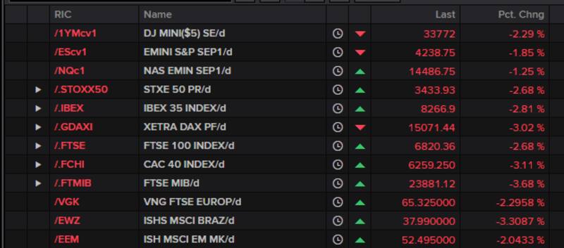 En Europa también se registran descensos importantes. Las pérdidas llegan al 2,7% en el caso del Stoxx50, al 2,8% para el Ibex, 3,02% para el Dax alemán y del 3,11% para la bolsa de Milán.
