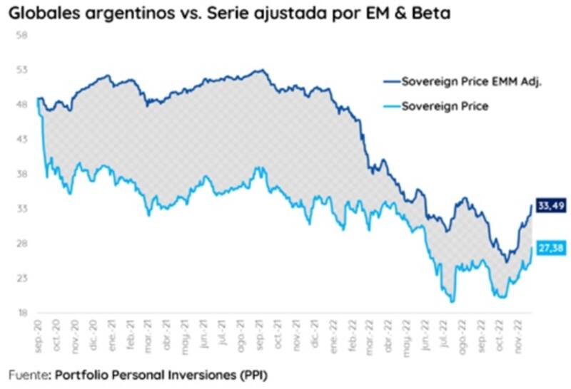 Además, agregaron que, observando nuestra serie del precio promedio de los Globales ajustada por un índice emergente y el beta histórico de los títulos, vemos que en las últimas nueve ruedas la deuda argentina siguió muy de cerca lo sucedido en el exterior.