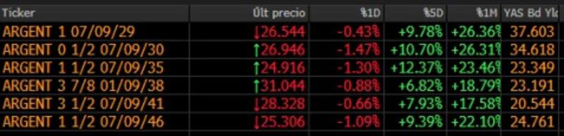 Todos los tramos de la curva argentina retroceden, con el tramo corto cayendo 0,43% en el Global 2029 y 1,.47% en el Global 2030.