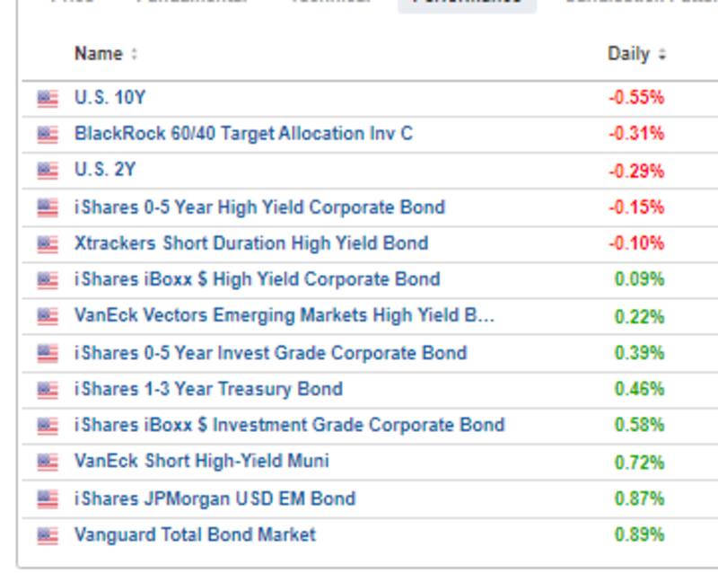El índice de bonos globales (Vanguard Total Bond Market) subió 0,9% ayer, junto con el índice de bonos de mercados emergentes. Los bonos de grado de inversión y de high yield también cerraron en verde.