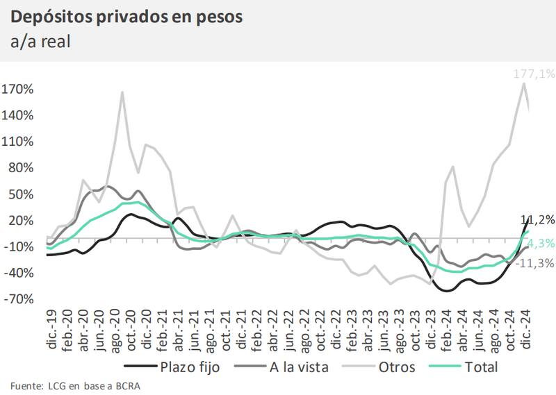 Los analistas de LCG estiman que el aumento real de los depósitos a plazo fijo tradicional fue de 3,8% mensual y 11,2% interanual, acumulando así cuatro meses consecutivos positivos. No obstante, señalan que el crecimiento fue menor al de los meses previos, posiblemente asociado con tasas de interés menos atractivas para el mercado.