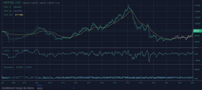 "El Merval exhibió un retorno de casi 43% en dólares a lo largo de 2022. Incluso, en lo que va de 2023 la tendencia se prolongó y el principal índice accionario argentino acumula una ganancia de más de 15% en moneda dura, ubicándose en 678 puntos y representando un nuevo récord desde las PASO de 2019", dijo.