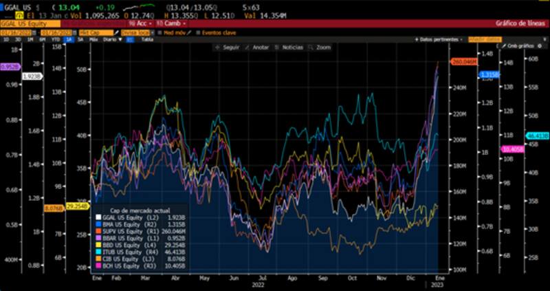 Grupo Financiero Galicia tiene una capitalización de mercado de u$s 1923 millones y Banco Macro de u$s 1315 millones. Las acciones de BBVA Argentina y Grupo Supervielle tiene un market cap de u$s 952 millones y de u$s 260 millones.