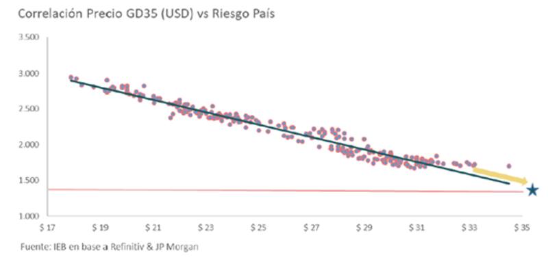 "Sobre un escenario conservador de un valor techo para los bonos de u$s 35, llegamos a un riesgo país equivalente de 1340 puntos. Llevando dicho análisis a la correlación entre el S&P Merval en dólares y el riesgo país, obtenemos un potencial de suba de cerca del 18% en dólares", dijo.