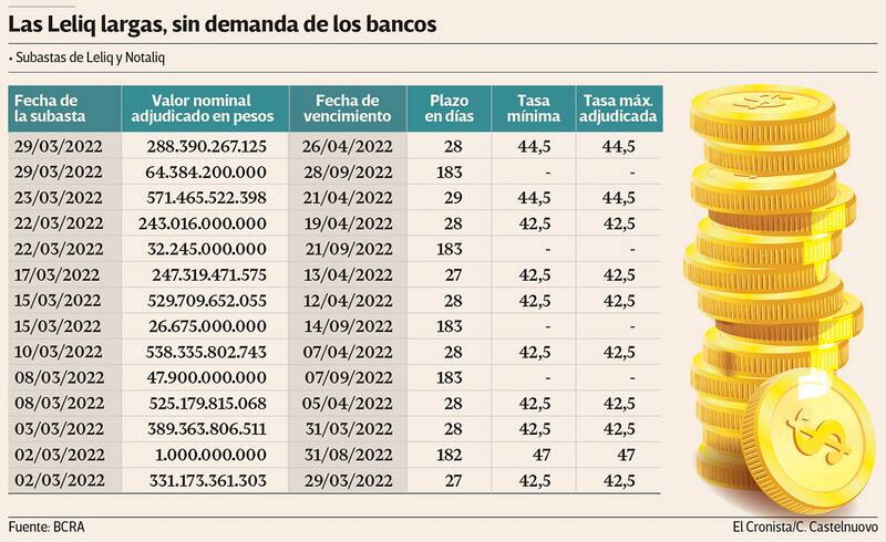 Por cuarta semana consecutiva, la autoridad monetaria debió declarar desierta la licitación de estos instrumentos creados a principios de enero para estirar los vencimientos de su deuda. Mayor aceptación tuvieron, en cambio, las Notaliq, que captaron $ 64.384 millones. Estos instrumentos, cabe recordar, le permiten a las entidades posicionarse en deuda a seis meses pero capturando eventuales subas de tasas.