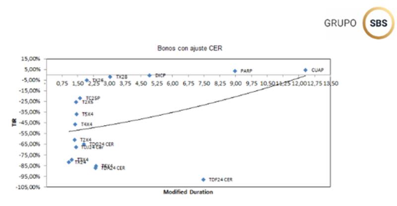 Hoy la curva CER opera con tasas de entre -88% y -5% en el tramo medio y largo de la curva. Incluso, bonos muy largos como el DICP o el PARP y el CUAP operan con tasas reales en 0% o levemente positivas.