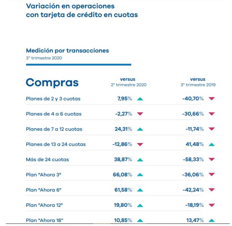De los números se desprende una serie de comportamientos vinculados con el uso de la tarjeta de crédito, asociado con la recesión. Por ejemplo, al observar los pagos en cuotas, caen respecto del 2° trimestre las relacionadas con los planes de los bancos. Del mismo modo, disminuyen las operaciones en un solo pago.