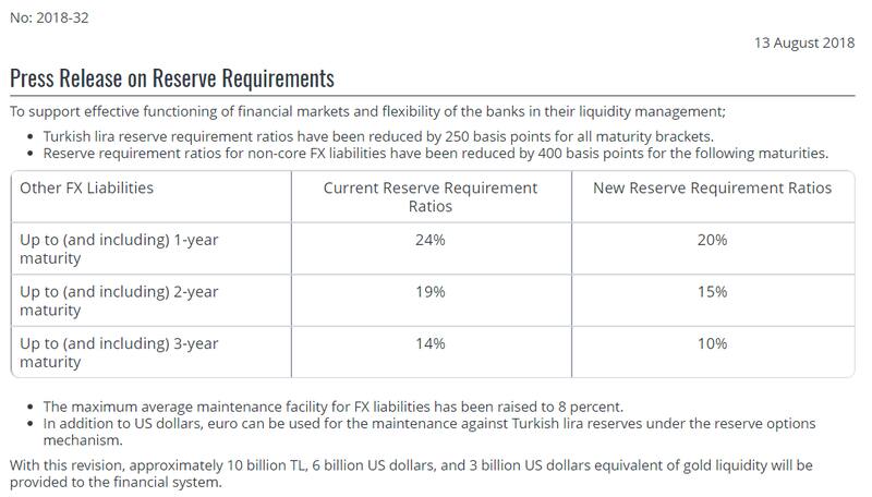 — CentralBankofTurkey (@CentralBank_TR) 13 de agosto de 2018“Con esta revisión, se inyectarán al sistema financiero aproximadamente 10.000 millones de liras (u$s 6.000 millones) y u$s 3.000 millones en liquidez equivalente al oro“, señaló la entidad en la nota, publicada en su página web.
