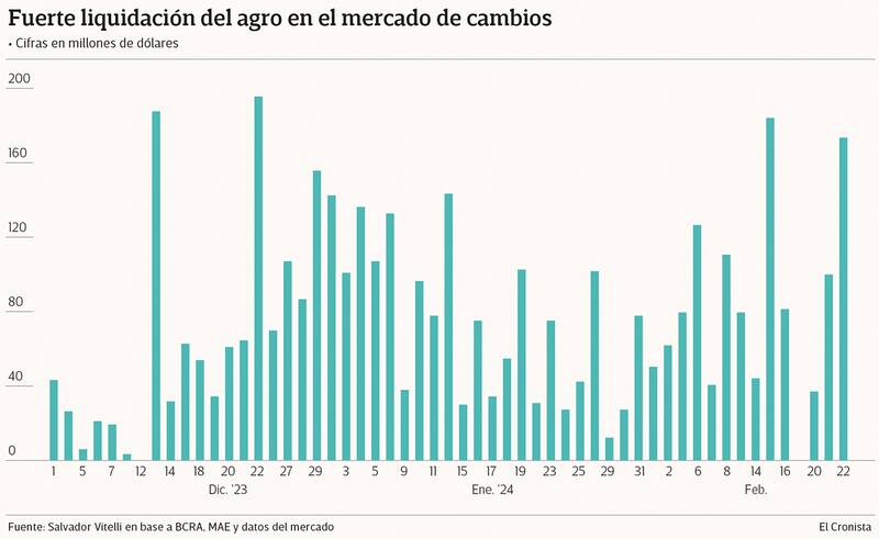Merino prevé que en lo que resta de febrero las liquidaciones de dólares se mantendrán firmes y la autoridad monetaria seguirá comprando reservas. Advierte que puede haber una merma en los volúmenes de compra neta, pero dependerá también del proceso de liberación al acceso al mercado de cambios para los importadores.