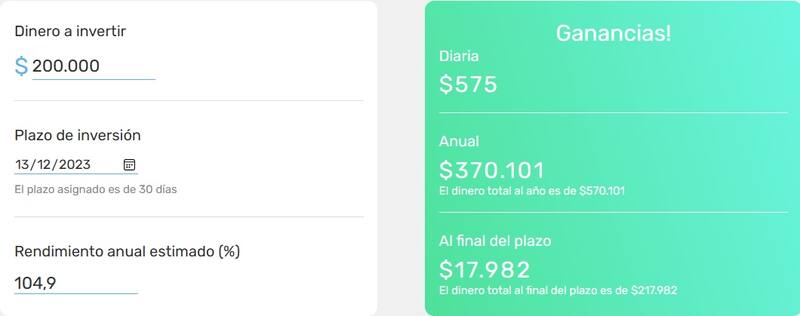 La tasa de interés anual, que actualmente se maneja, esdel 104,9%. Sin embargo, puede variar diariamente, lo que generará cambios en tus ganancia diarias.