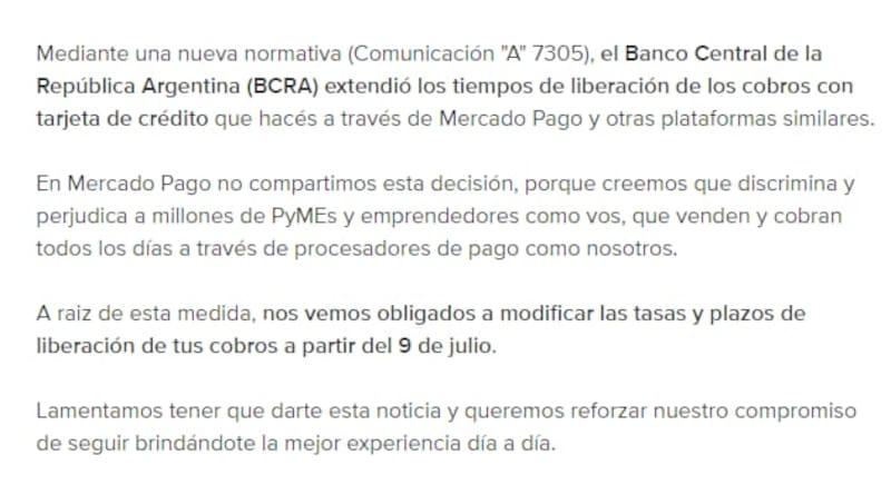 En un comunicado dirigido a sus clientes, la empresa fundada por Marcos Galperín destacó que el aumento que los usuarios deberán afrontar a partir del 9 de julio responde a la "extensión de los tiempos en la liberación de los cobros de tarjeta de crédito" que dispuso la autoridad monetaria mediante la Comunicación A 7305 y que afecta a Mercado Pago y otras plataformas similares.