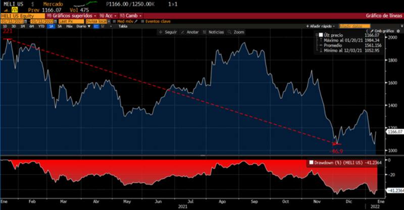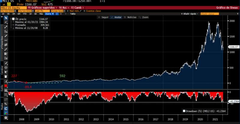 Salvo en el 2008, nunca en la historia MercadoLibre había enfrentado semejante proceso correctivo. En aquel año, había caído 89% desde sus máximos, mientras que en la actualidad, la pérdida es del 41%.