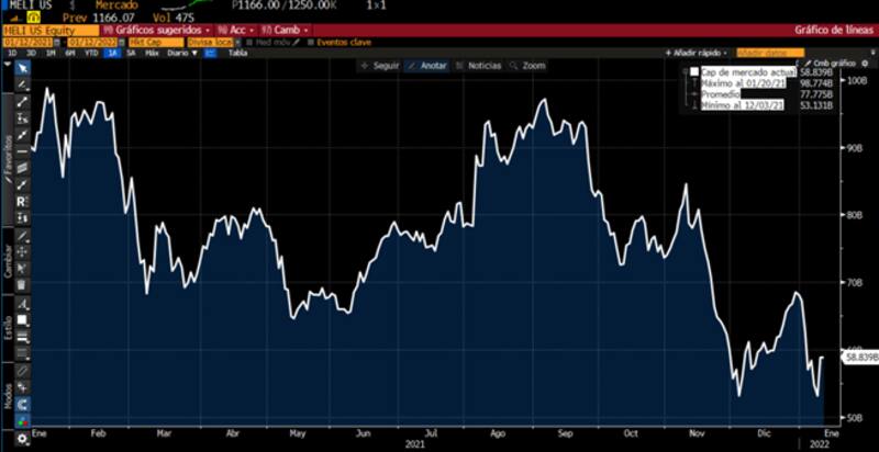 Si a este ajuste lo traducimos en valor de mercado, MercadoLibre pasó de valer $ 98.600 millones en enero de 2021 a u$s 58.800 millones actualmente.
