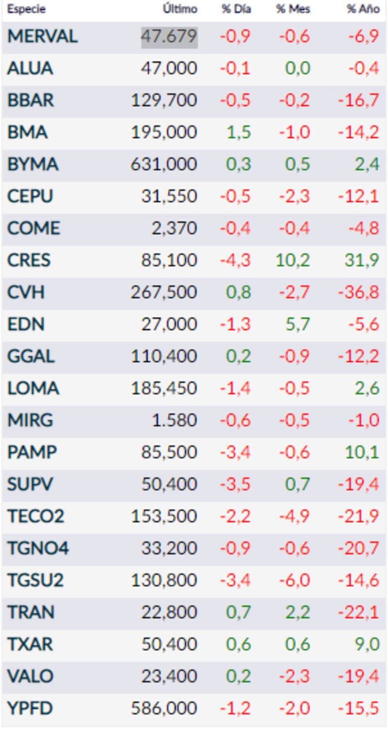 El panel líder mostró más velas rojas que verdes y la principal caída la tuvo Cresud (4,3 por ciento).