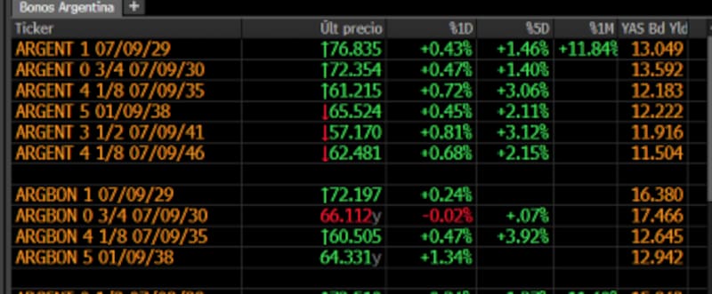 Los bonos argentinos suben entre 9% y 13% en los distintos tramos de la curva, alcanzando nuevos máximos. Sin embargo, los bonos emergentes operaron con pérdidas en el último mes, marcando un descenso de 2%.