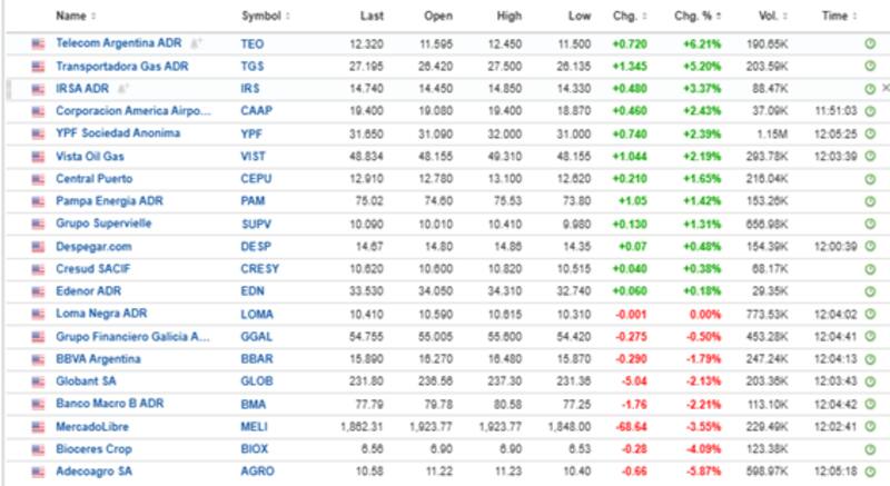 Las acciones en Wall Street operaron en forma mixta. Las mayores subas se dan en Telecom, que ganó 10,8%, seguida por TGS, IRSA, Corporación América, YPF y Vista, con subas de entre 4% y 5%.