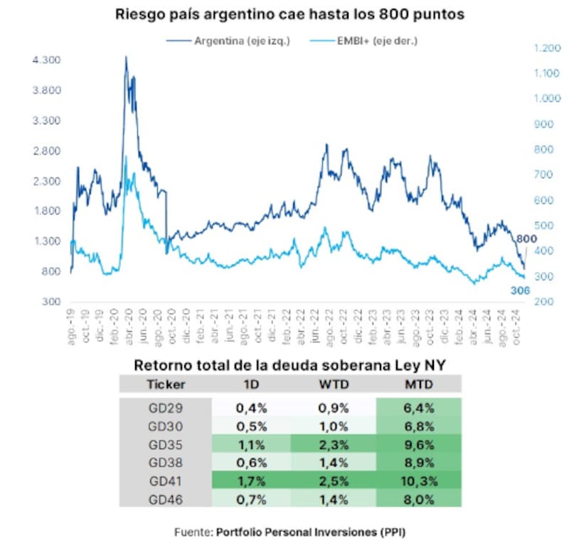 Debido al avance de hoy, el riesgo país volvió a caer y perforó los 800 puntos, para ubicarse en 772 puntos al final de la rueda.