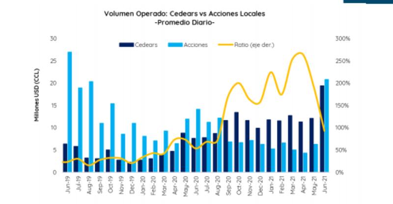 "Las acciones siguen superando a los Cedear en lo operado en junio. En promedio por día se operaron en acciones u$s 20.8 millones en lo que va del mes, mientras que en Cedear, se operaron u$s 19.4 millones por día", señaló un informe de Portfolio Personal Inversiones (PPI).