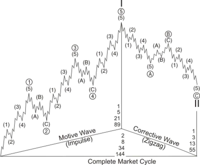 Elliott plantea que las bolsas se mueven en ciclos, determinando que cada ciclo tiene un movimiento impulsivo (a favor de la tendencia), caracterizado por 5 ondas internas, seguido de uno contractivo (o en contra tendencia) con 3 ondas internas. La suma de las 5 ondas impulsivas y 3 en contra tendencia da 8 movimientos completos.