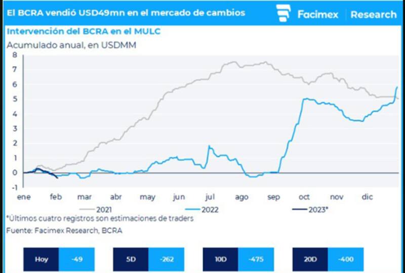 "Desde el inicio del 2023, el BCRA ha tenido que vender cerca de u$s 520 millones en el MULC. A ese monto debemos sumarle cerca de u$s 480 millones del programa de recompra de deuda y pagos al FMI y demás organismos internacionales que suman aproximadamente unos u$s 4200 millones y el pago de los cupones de los bonos soberanos (ocurrido el 9 de enero) que demandó u$s 1021 millones", detalló.