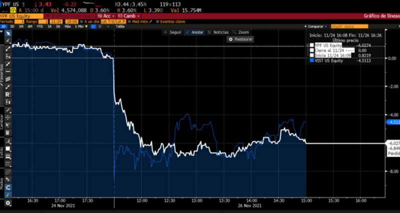 La volatilidad en el sector también se sintió en argentina con las acciones de Vista Oil e YPF operando a la baja. La acción petrolera descendió 6% mientras que la compañía que dirige Miguel Galuccio registró una caída del 4,5% en el día de hoy.
