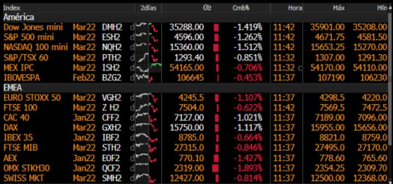 En Europa, las bolsas también recortan posiciones y operan con pérdidas. El Stoxx600 cae 1,1%, mientras que el CAC 40 de Francia y el DAX30 de Alemania son los índices que más ceden en el viejo continente, perdiendo 1,1% y 1,15% respectivamente.
