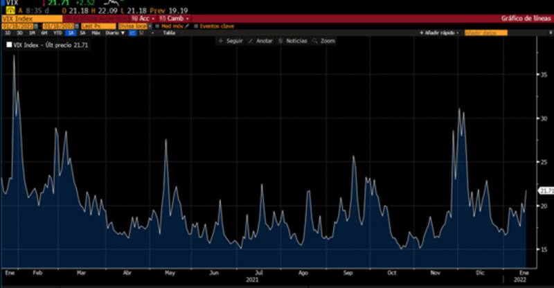 El índice VIX sube a niveles de 21,7 puntos, desde los 18 puntos que había cerrado la semana pasada. De esta manera, el llamado "índice de miedo" se ubica en su mayor valor en tres semanas.