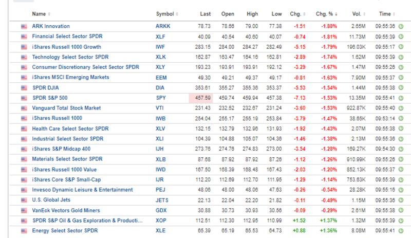 Las pérdidas son lideradas por el sector de tecnología, mas especificamente el de crecimiento a largo plazo enmarcado por el ETF de ARK Innovation que cae 1,9%, seguido por el sector financiero que retrocede 1,8%, el tecnológico pierde 1,77% al igual que el de consumo discrecional que retrocede 1,75%