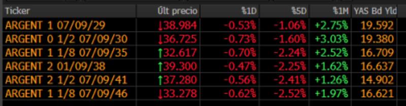 En este contexto, los bonos argentinos muestran un inicio en terreno negativo. Todos los tramos de la curva muestran una pre apertura con pérdidas, registrando descensos en la parte mas corta del 0,6%, un descenso del 0,6% en promedio en la parte media y del 0,55% en la parte mas larga de la curva.