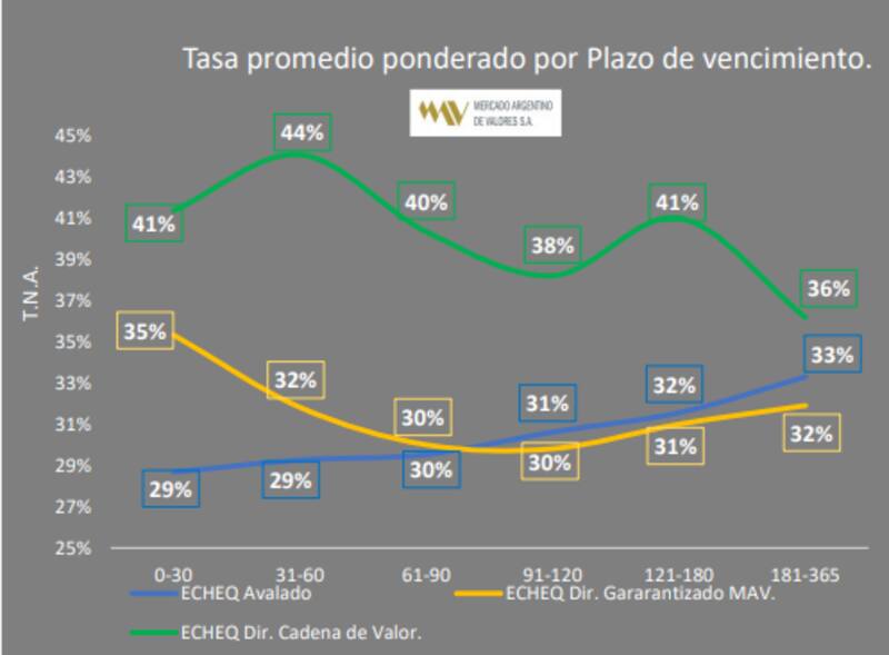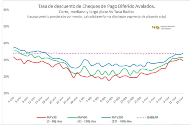 Según dados del Mercado Argentino de Valores (MAV), dada la caída en el volumen en los primeros días de marzo, las tasas de cheques de cheques garantizados y avalados se desplazaron al alza y actualmente se encuentran operando en torno al 30% para el descuento de cheques hasta 90 días y del 35% hasta 360 días.
