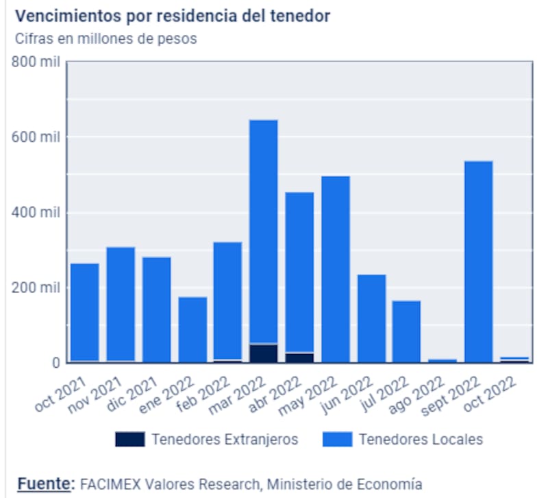 Según datos elaborados por los analistas de Facimex Valores, en lo que resta del año actual vencen cerca de $ 856.000 millones. En todos los meses hay vencimientos mayores a $ 200.000 millones, esto implica cerca del 2% del PIB.